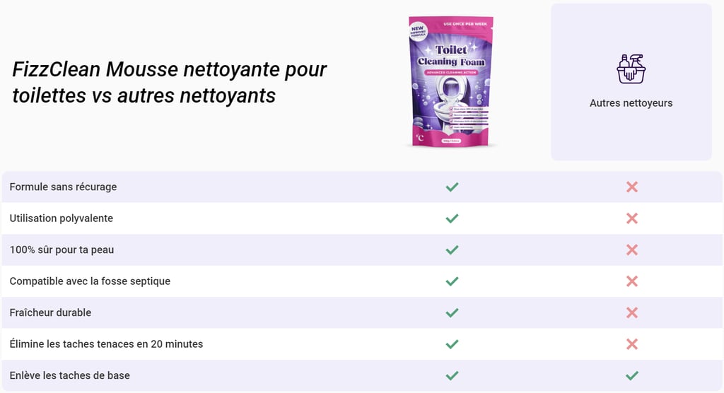 Pourquoi faire du nettoyage de tes toilettes une corvée redoutable? Avec FizzClean, plus besoin de frotter, de se pencher ou de s’approcher de la saleté. Il suffit de verser le produit, d’attendre et de laisser la technologie de pointe des surfactants faire tout le travail à ta place. FizzClean est l’avenir du nettoyage sans effort, laissant les nettoyants traditionnels dans le passé.